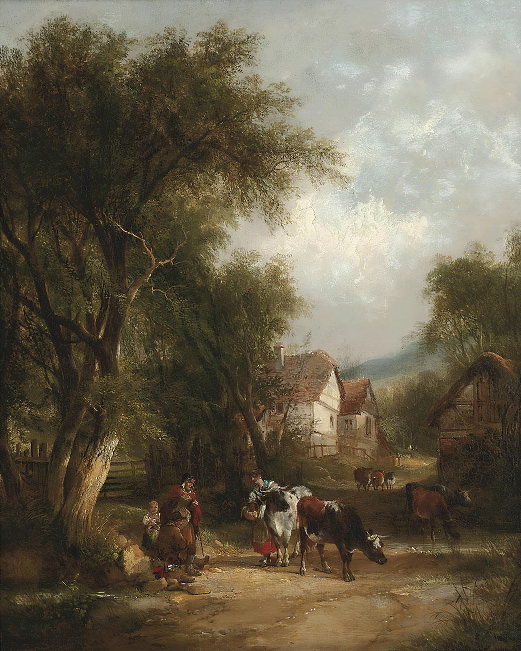 Картина Уильяма Шайера «Разговор по дороге на рынок» с необычайной интимностью передает мимолетный момент сельской жизни. Композиция изображает две фигуры, живо беседующие на фоне деревенского проселка. С помощью искусных мазков кисти и искусного владения светом и тенью Шейер наполняет сцену ощутимым чувством жизненной силы и человеческой связи. Зритель затягивается в разговор, подслушивая их общение, будто он причастен к частному моменту, разделенному между знакомыми.