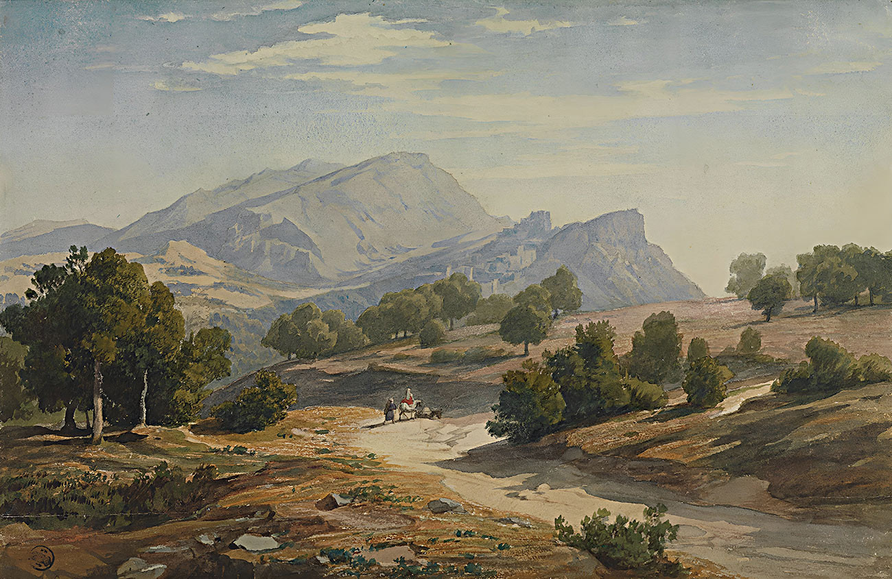 репродукция пейзажа художника Ширмера Иоганна — "Вид с востока на Рокка-Кантерано и Мамелл на заднем плане"