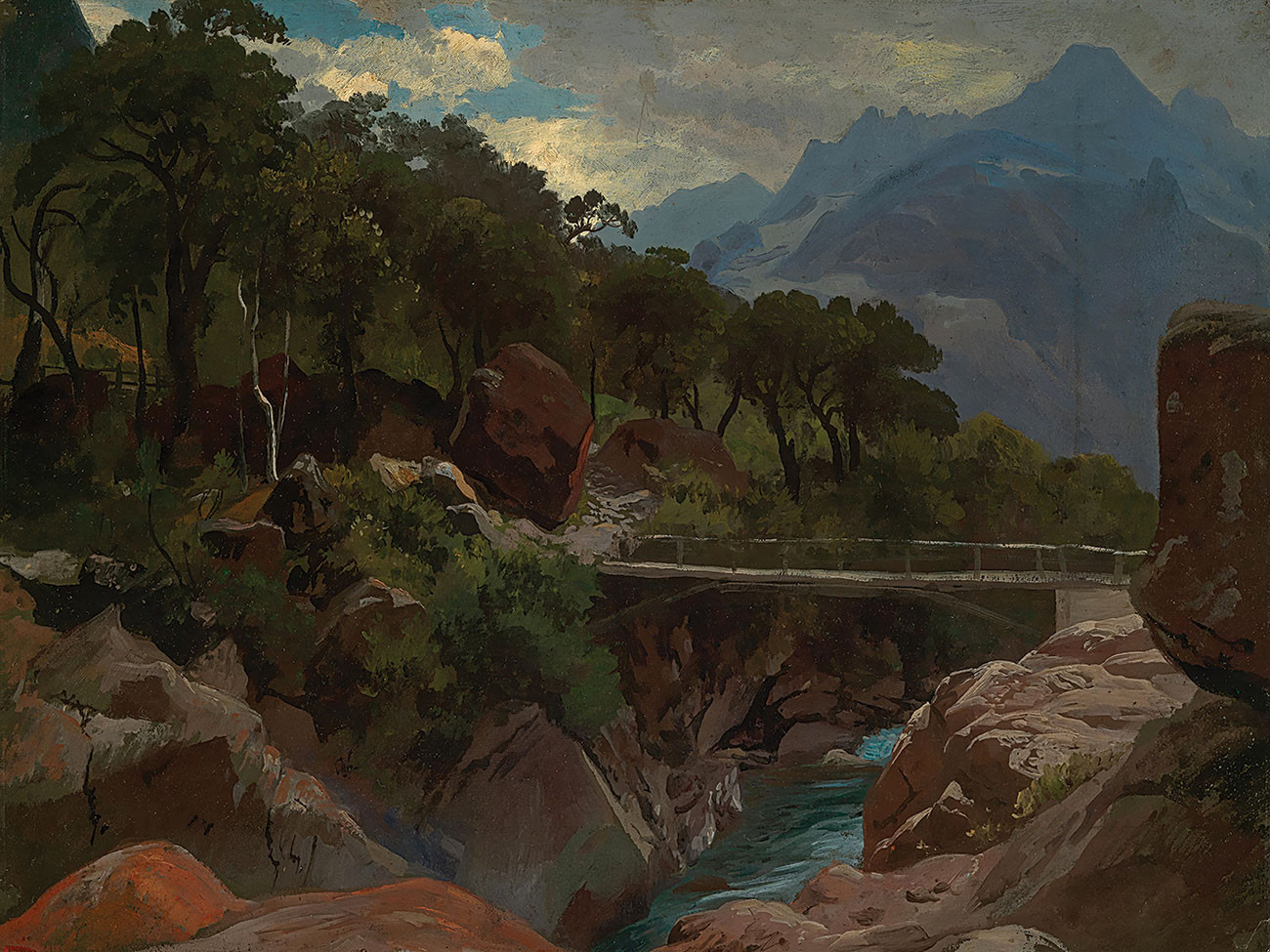₴ Репродукция пейзаж "Швейцарская горная река с пешеходным мостом" - Ширмер Иоганн Вильгельм