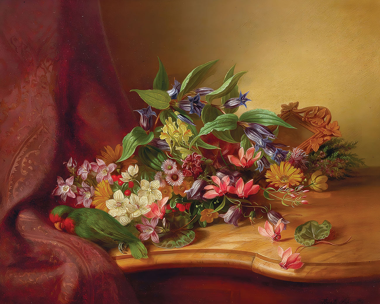 ₴ Репродукция цветочный натюрморт "Цветы с попугаем" - Шустер Адель