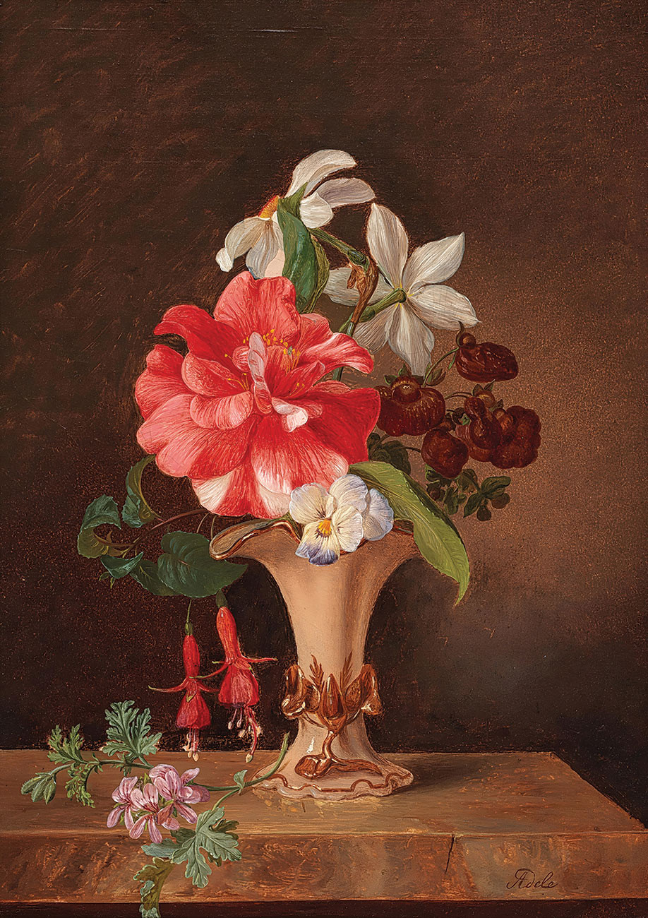 ₴ Репродукция цветочный натюрморт "Букет цветов с камелиями и нарциссами" - Шустер Адель
