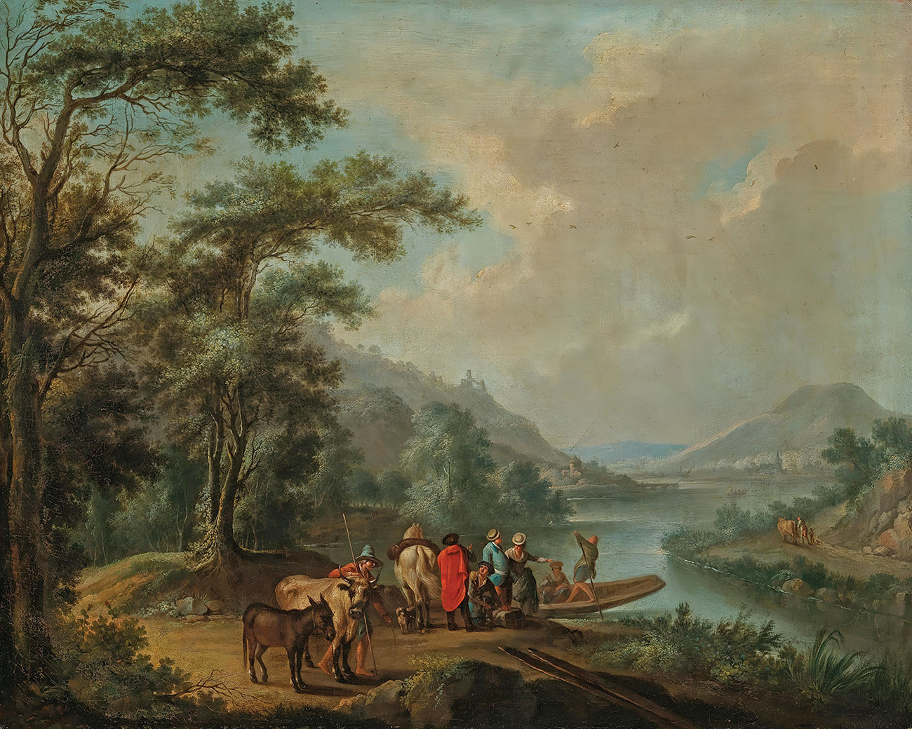 ₴ Репродукция пейзаж "Рейнский пейзаж с паромом, недалеко от Бонна с Роландсбогеном, Драхенфельсом и островом Нонненверт за пределами" - Шютц Кристиан Георг Старший