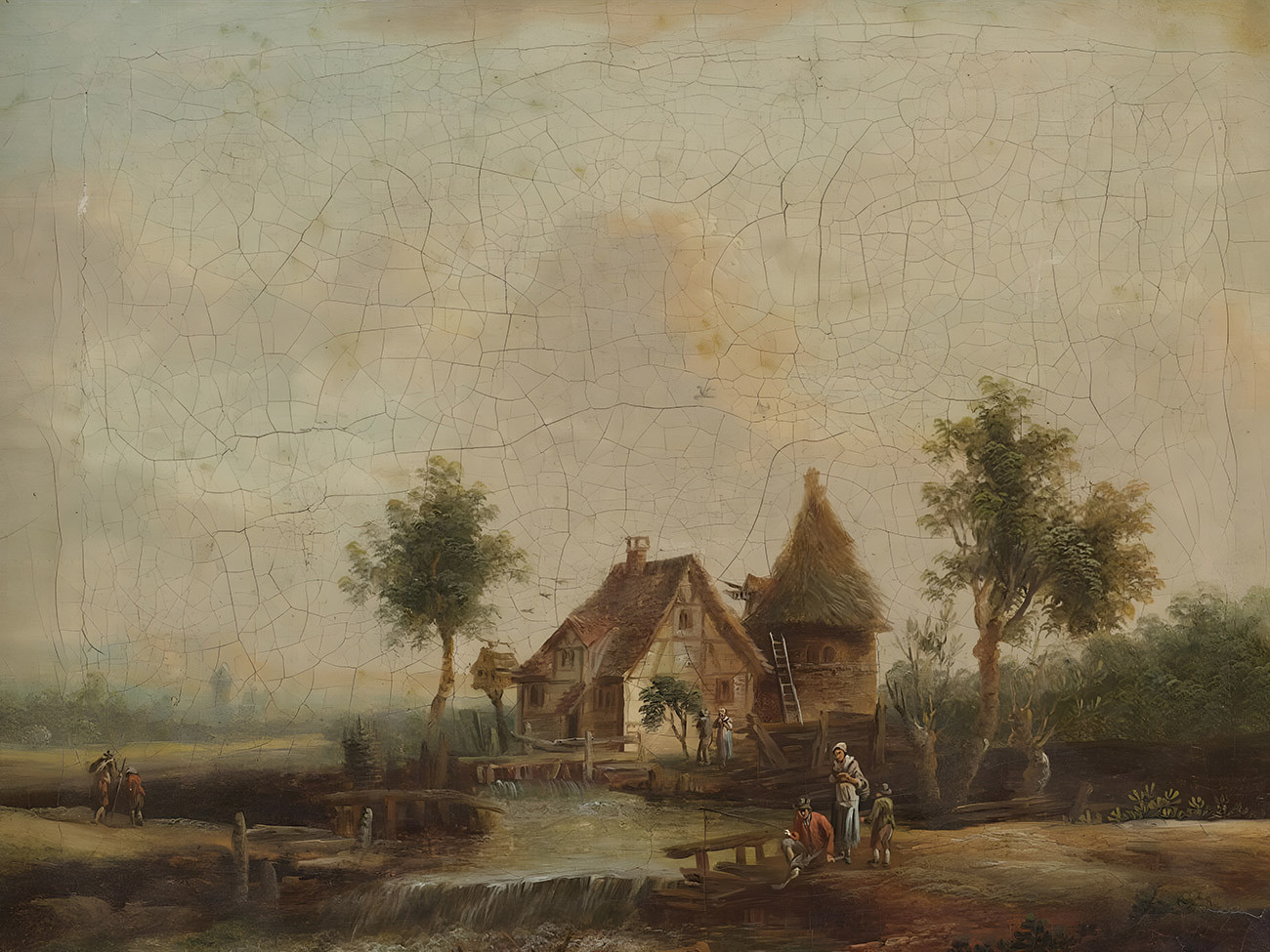 репродукция пейзажа художника Шютца Кристиана — "Пейзаж с мельницей и крестьянами, ловящими рыбу"