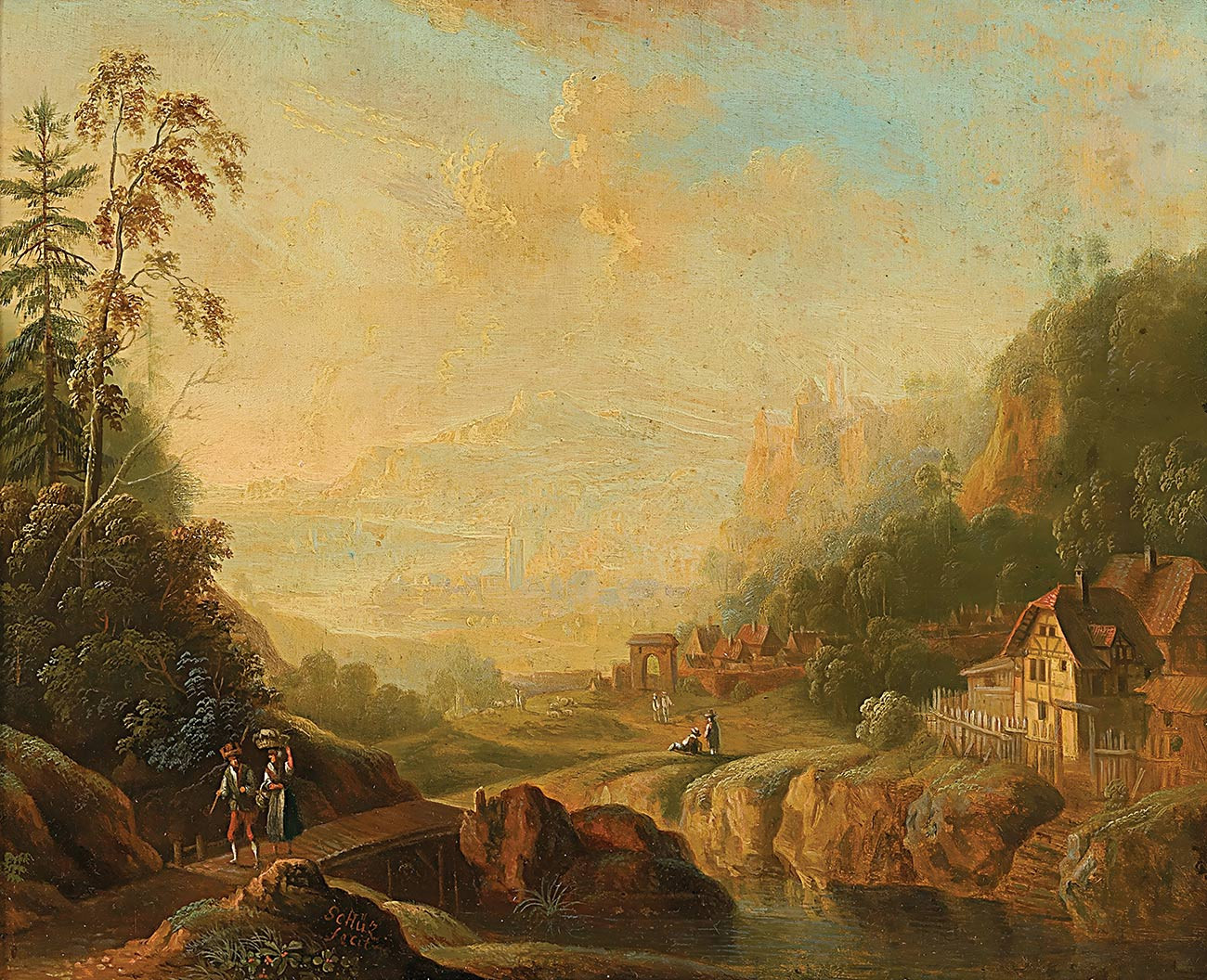 репродукция пейзажа художника Шютца Кристиана — "Большой речной ландшафт с путниками"
