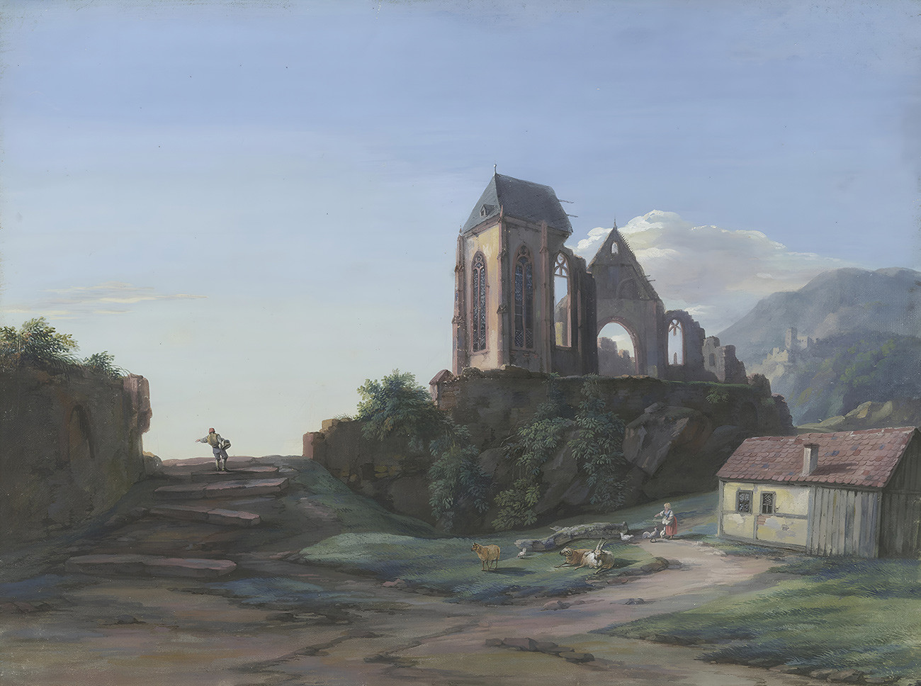 ₴ Репродукция пейзаж "Руины готической церкви, замок на заднем плане, овцы, коза и ребенок кормят кур возле хаты, мужчина с корзиной" - Шютц Кристиан Георг Старший