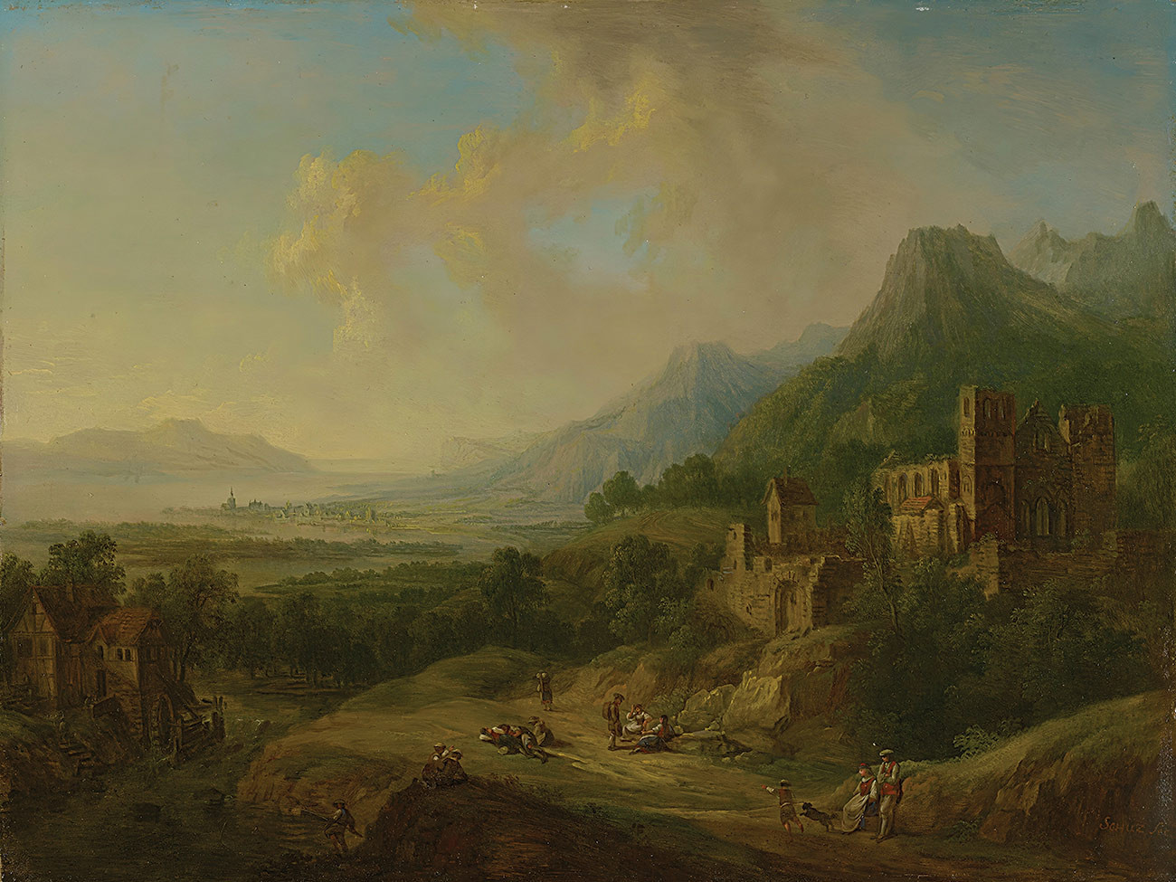 репродукция пейзажа художника Шютца Кристиана — "Речная долина с руинами церкви и фигурами"