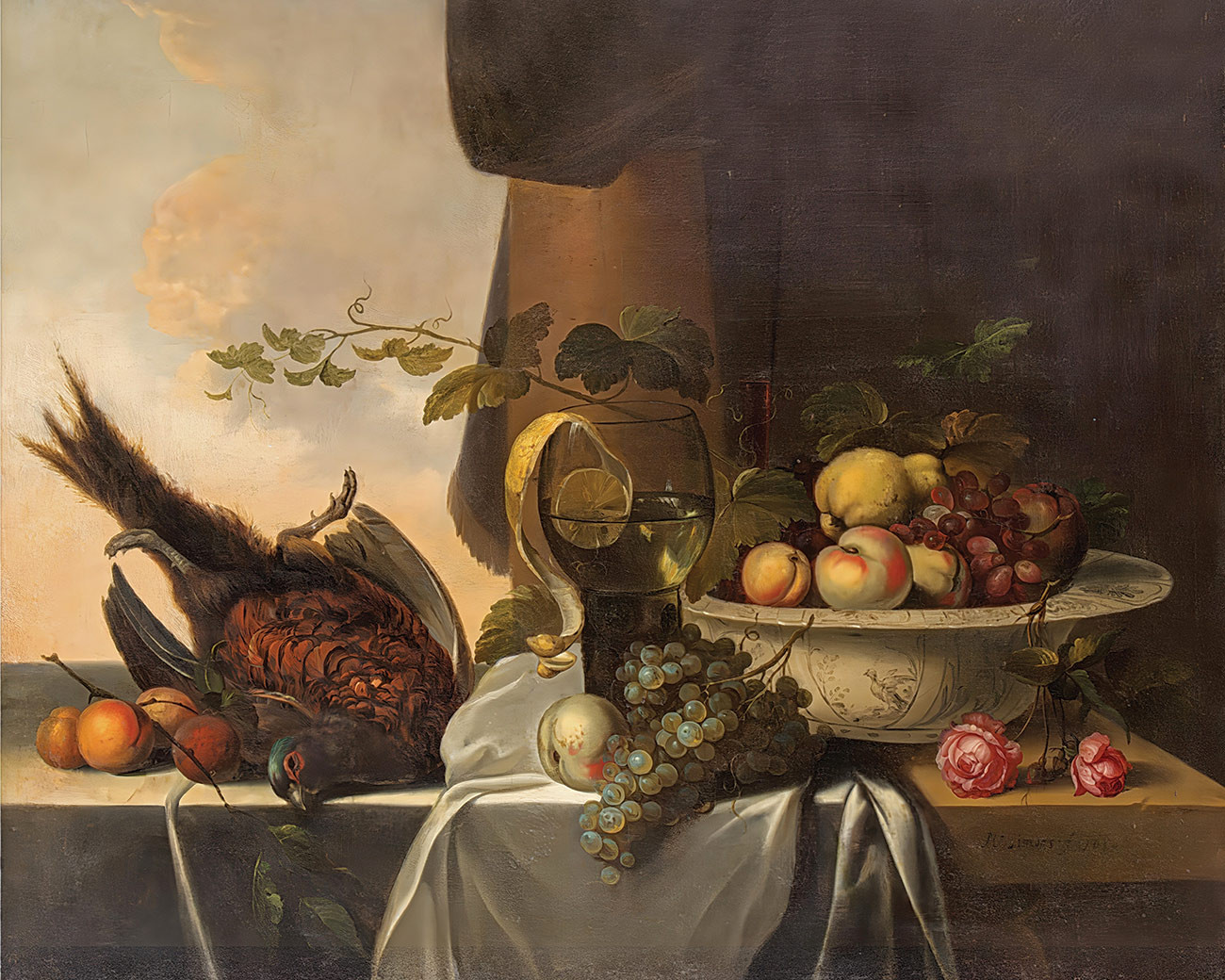 купите репродукцию натюрморт художника Симонса Михеля — "Натюрморт с фазаном, ремером с лимоном и миской с фруктами"