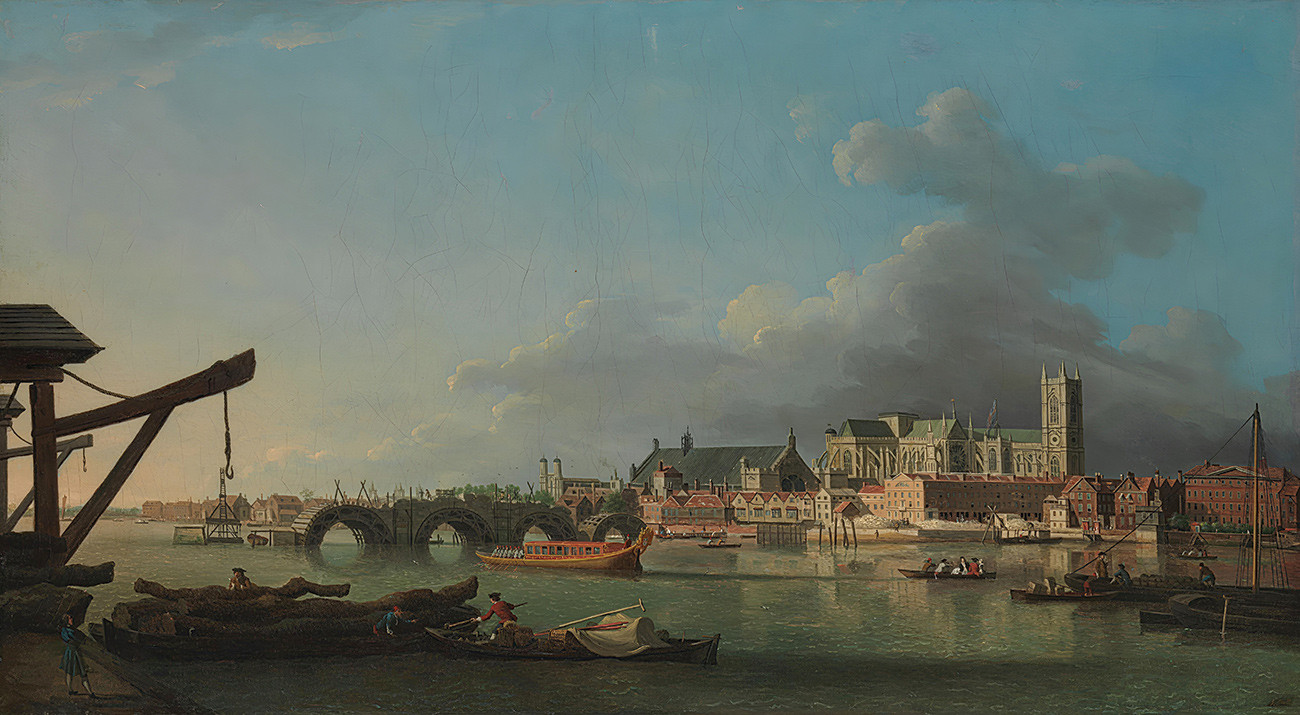 Слева от этого вида Лондона и Темзы находится еще не законченный Вестминстерский мост. За ним слева направо находятся Сент-Джонс, площадь Смита, Вестминстер-холл, Вестминстерское аббатство и башня церкви Святой Маргарет. Работы на Вестминстерском мосту начались в 1738 году и были завершены в 1750 году. Здесь показано примерно в том состоянии, в котором он достиг бы к 1742 году.