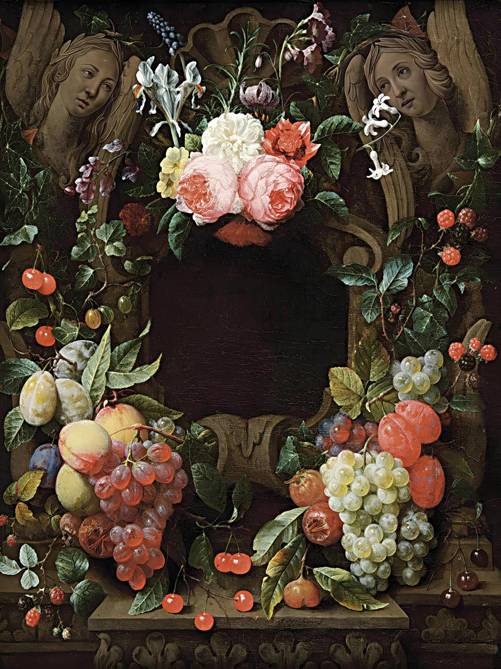 купить репродукцию натюрморт художника Сона Йориса — "Картуш с лепными ангелами в обрамлении цветов и фруктов"