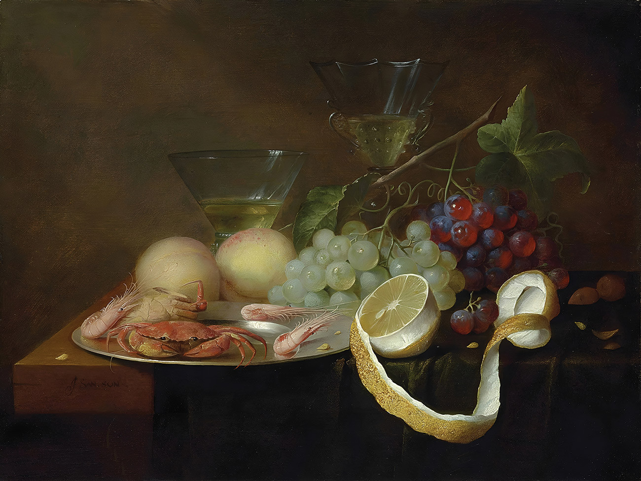 купить репродукцию натюрморт художника Сона Йориса — "Натюрморт с крабами и креветками на оловянном блюде, фруктами и другими объектами"