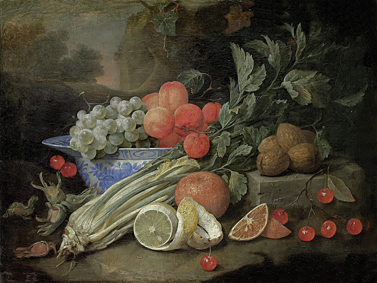 ₴ Репродукция натюрморт "Натюрморт с фруктами на фоне пейзажа" - Сон Йорис ван