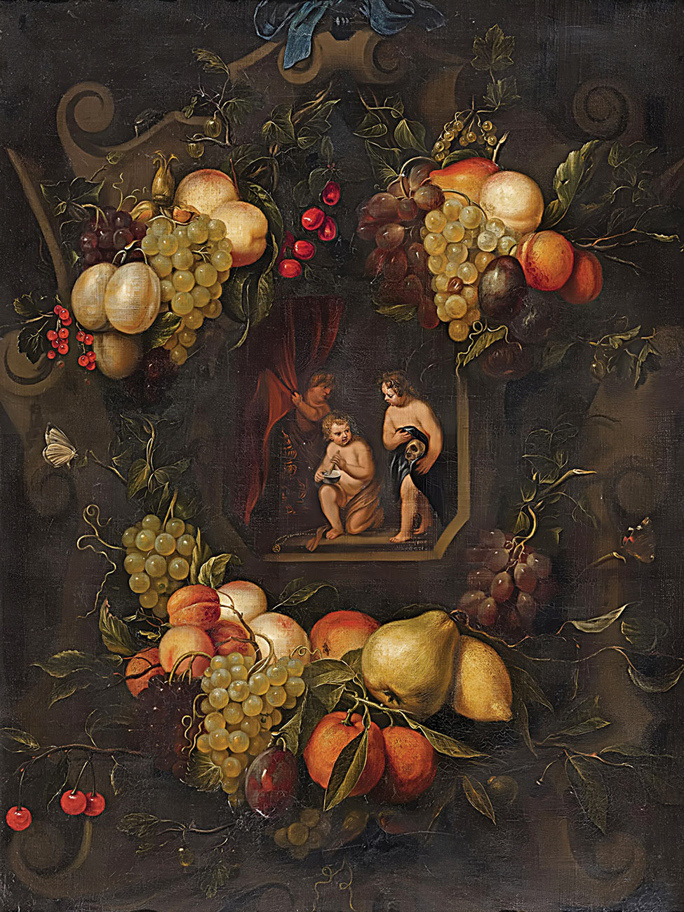 ₴ Репродукция натюрморт "Три путти с атрибутами Vanitas в фруктовой гирлянде" - Сон Йорис ван