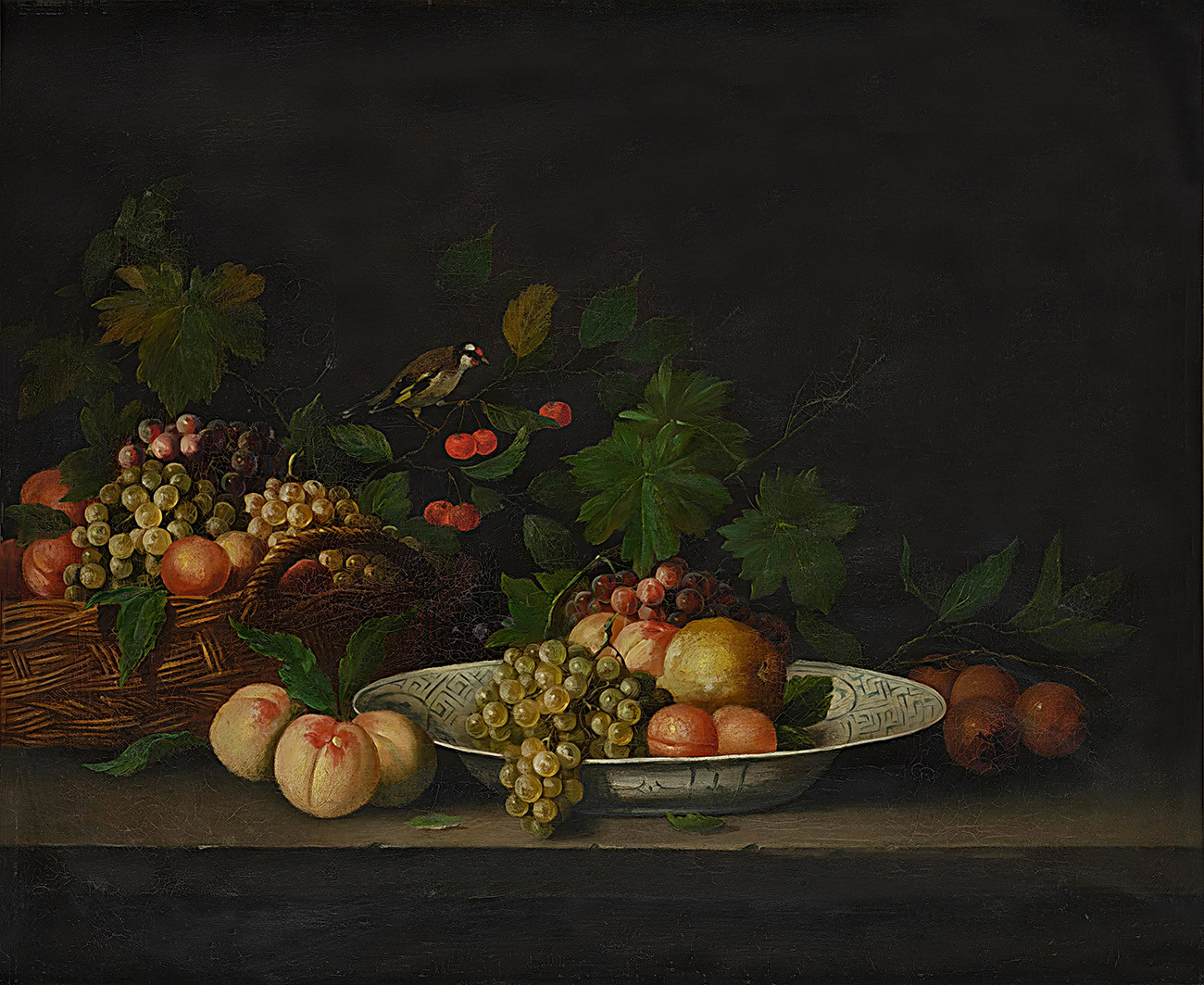 купить репродукцию натюрморт художника Сона Йориса — "Натюрморт со щеглом, фруктами и тарелкой"