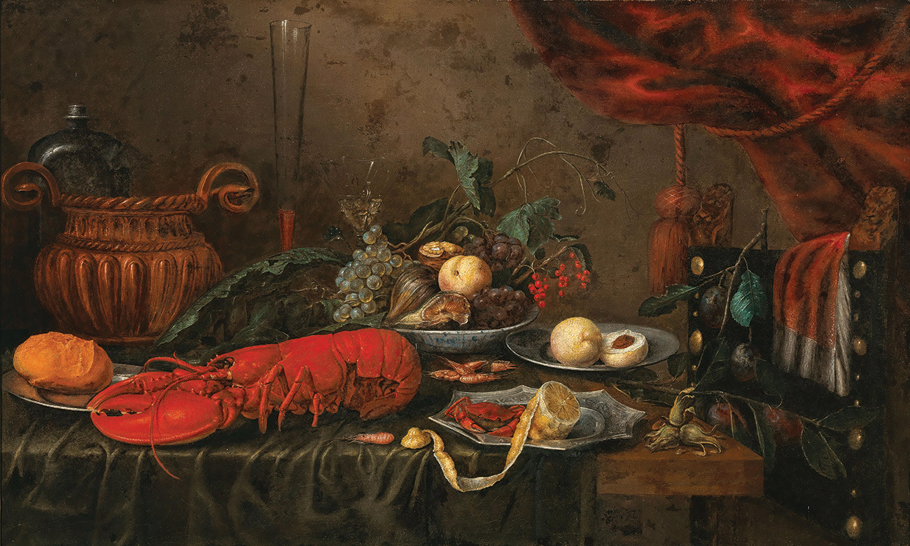 купить репродукцию натюрморт художника Сона Яна — "Натюрморт с вареным омаром, фруктами и бокалом вина"