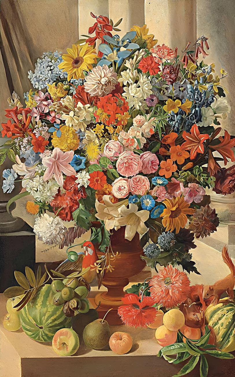 ₴ Репродукция натюрморт "Цветочный натюрморт с попугаем и белкой" - Столл Леопольд фон