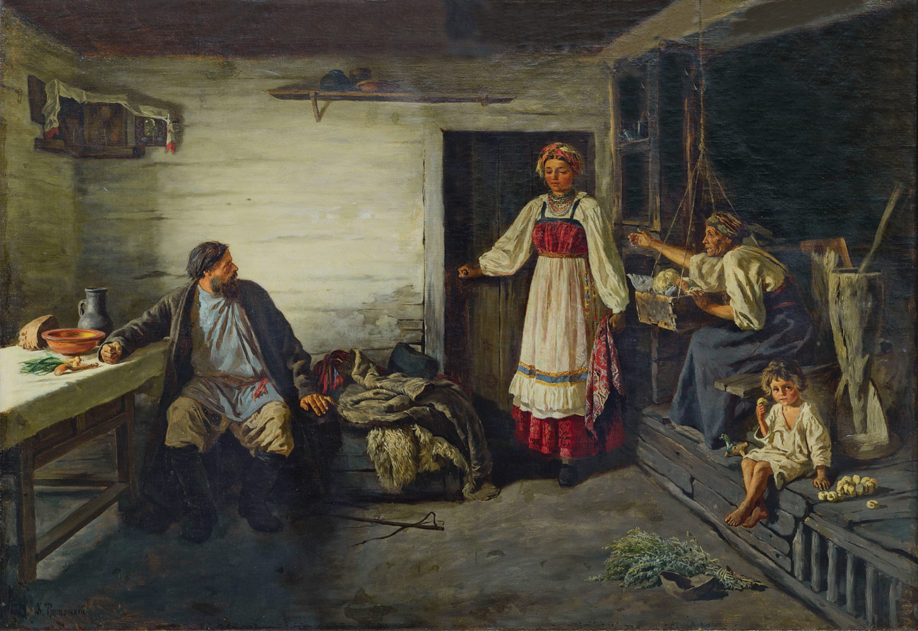 ₴ Репродукция бытовой жанр "Где была?" - Трутовский Константин Александрович