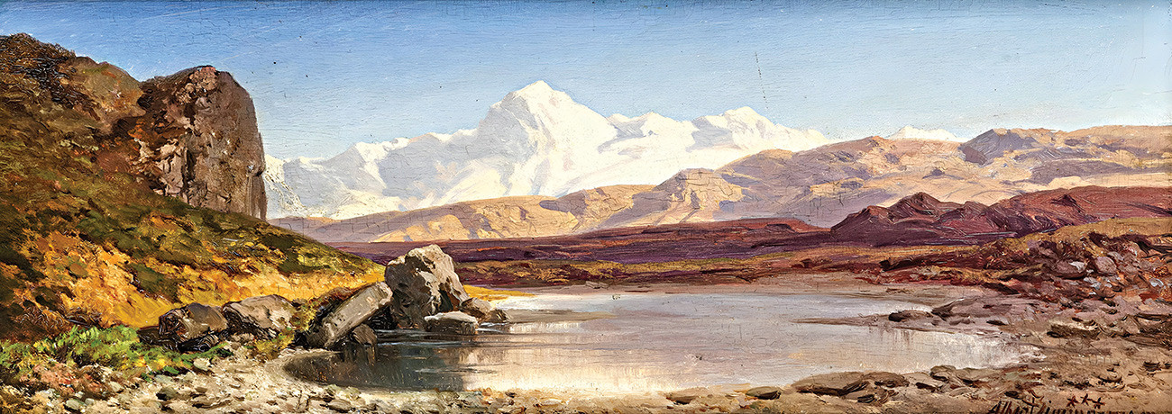 репродукция пейзажа художника Циммерманна Августа — "Озеро в Альпах, на заднем плане горный хребет Монте-Роза в Швейцарии"