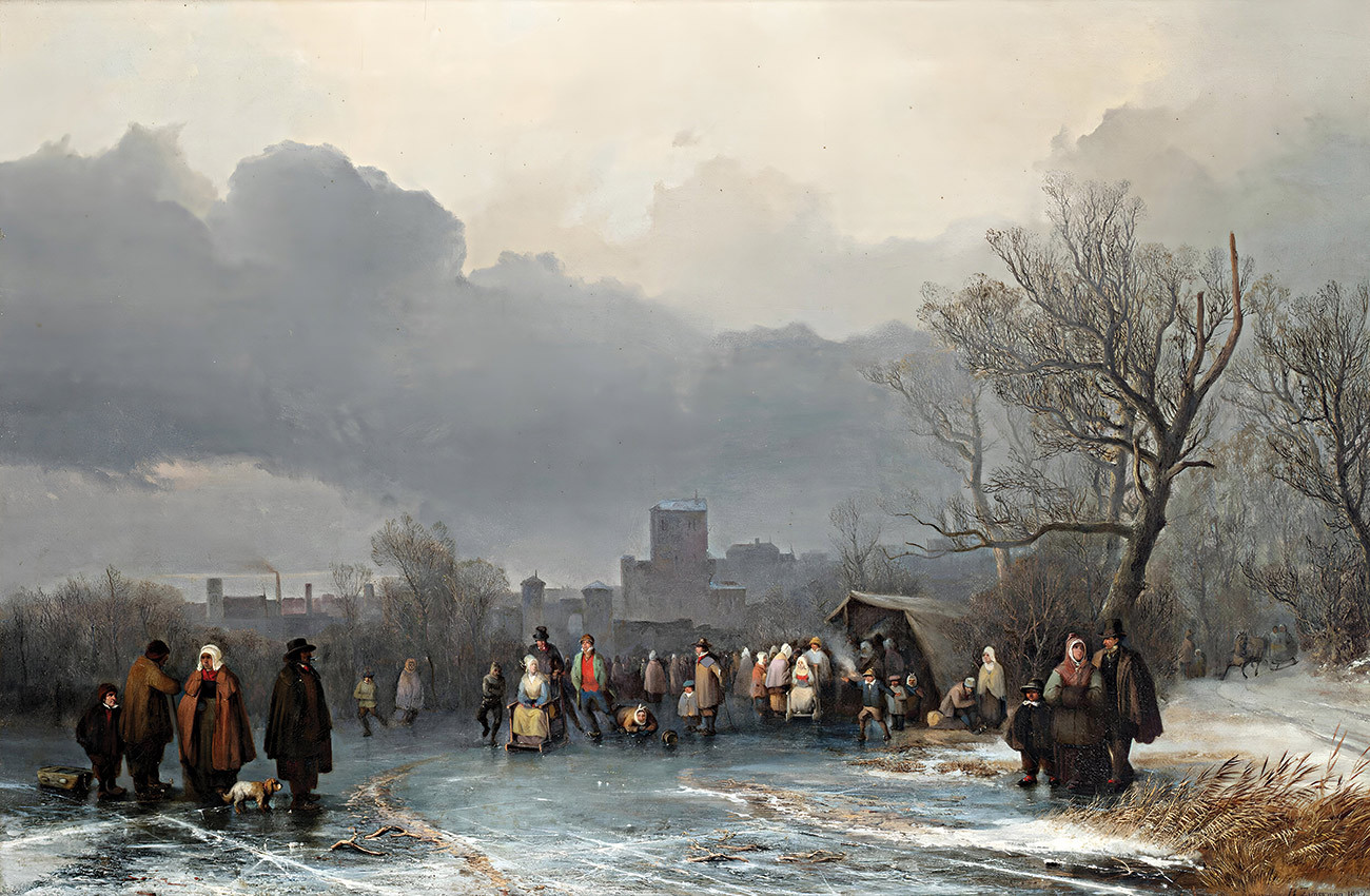 ₴ Репродукция пейзаж "Зимний пейзаж с фигурами на коньках на фоне города" - Циммерманн Ричард