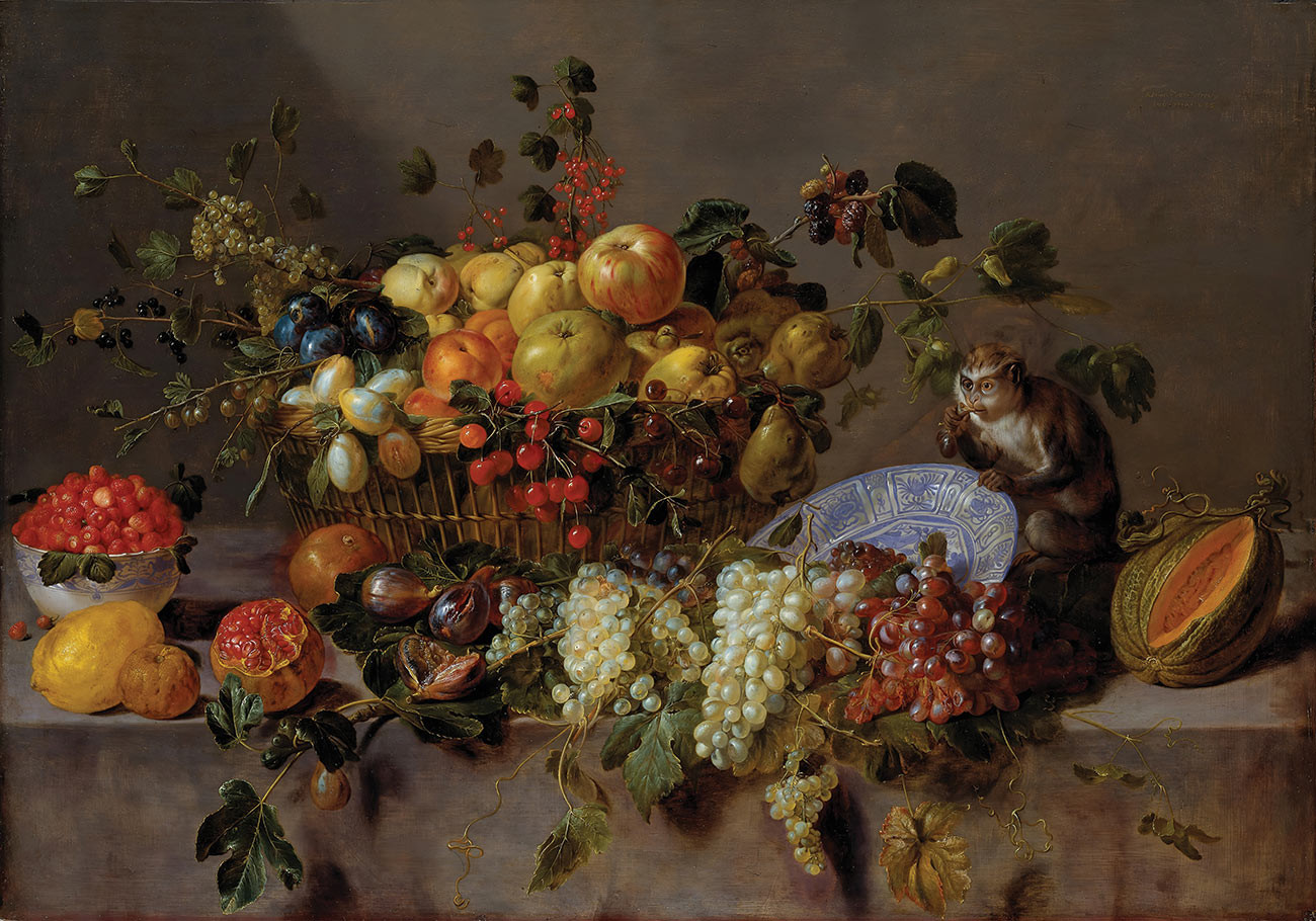 «Натюрморт с фруктами и обезьяной, что ест виноград» Адриана ван Утрехта – пример склонности голландского Золотого века к тщательно продуманным деталям и символическому богатству. Композиция содержит щедрый рог обилия спелых фруктов, включая виноград, гранаты и инжир, залитые теплым золотым светом. Озорная обезьяна, сидящая на вершине композиции, игриво пожирает кисть винограда, добавляя нотку животности и капризности к иначе беззаботной сцене.
