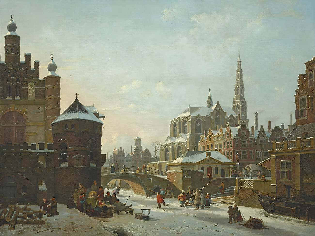 ₴ Репродукция городской пейзаж "Каприччио с фигурами на замерзшем канале" - Верхейен Хендрик Ян