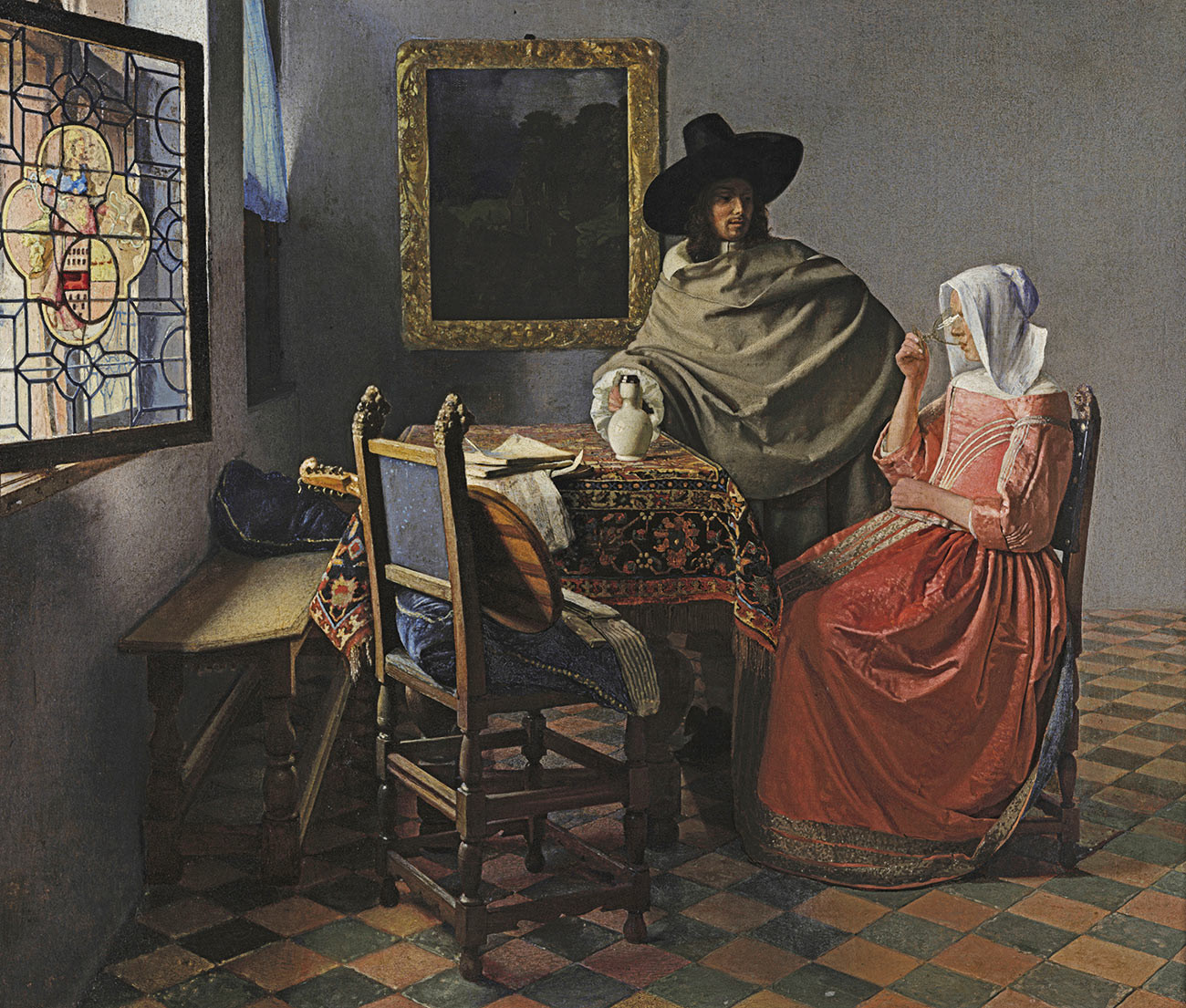 Элегантно одетый молодой человек смотрит, как женщина заканчивает бокал вина. Он положил руку на кувшин и, кажется, ждет, чтобы пополнить стакан. Вермеер принял традиционный мотив "вина, женщина и песни" и, очевидно, под влиянием картины Терборха, превратил его в выдающийся тет-а-тет.