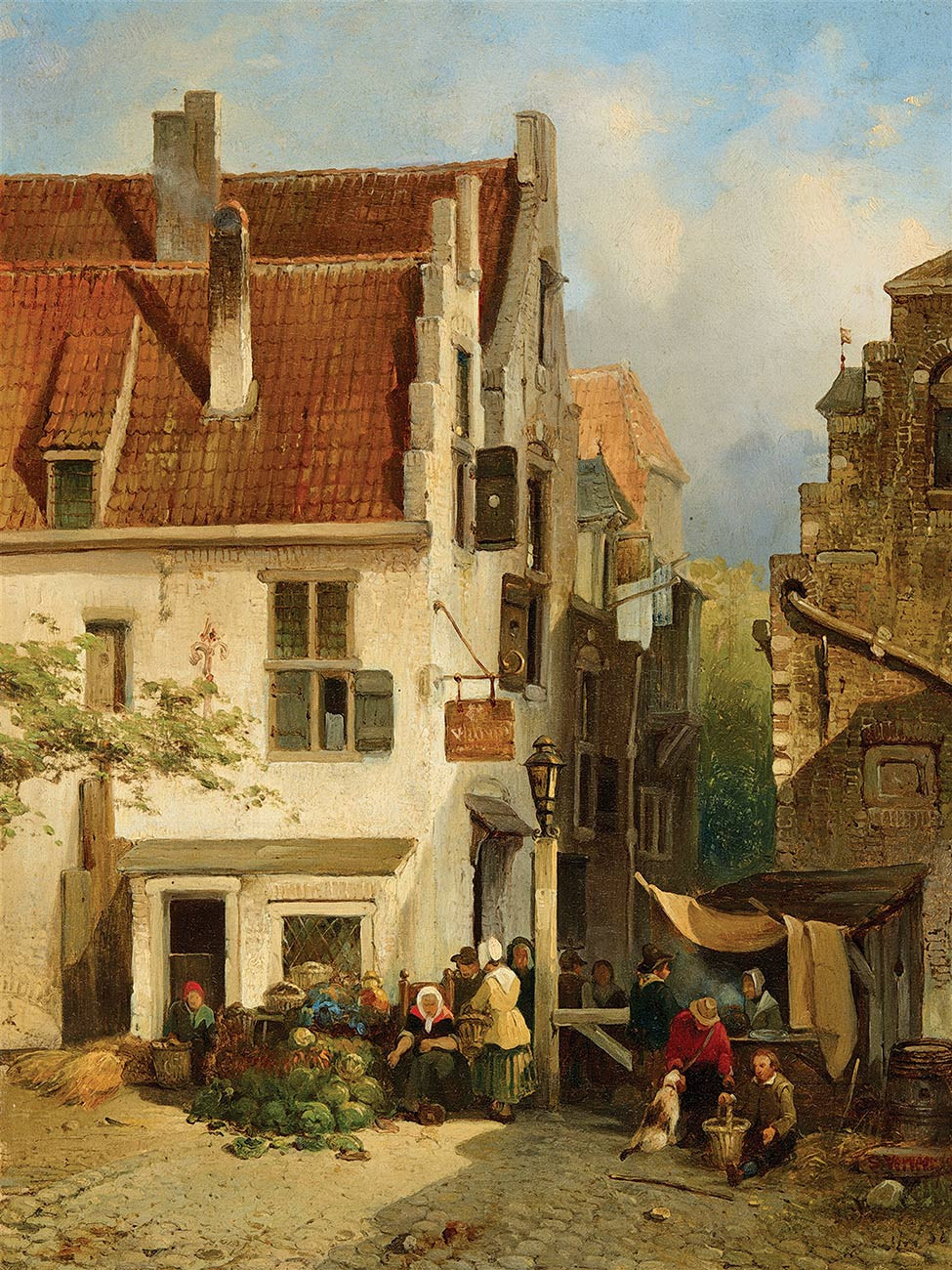 репродукция городского пейзажа художника Вервир Саломона — "Вид на голландский город с рыночными лотками"