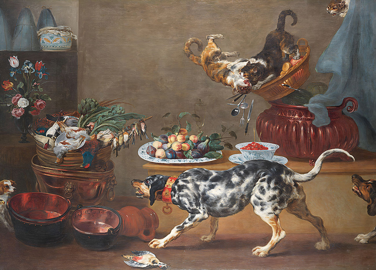 купить репродукцию натюрморт известного художника Воса Пауля — "Различные цветы в вазах, инжир и клубника в фарфоровых чашах Kraak, с медной посудой, дичью, бьющимися котами и собаками на переднем плане"