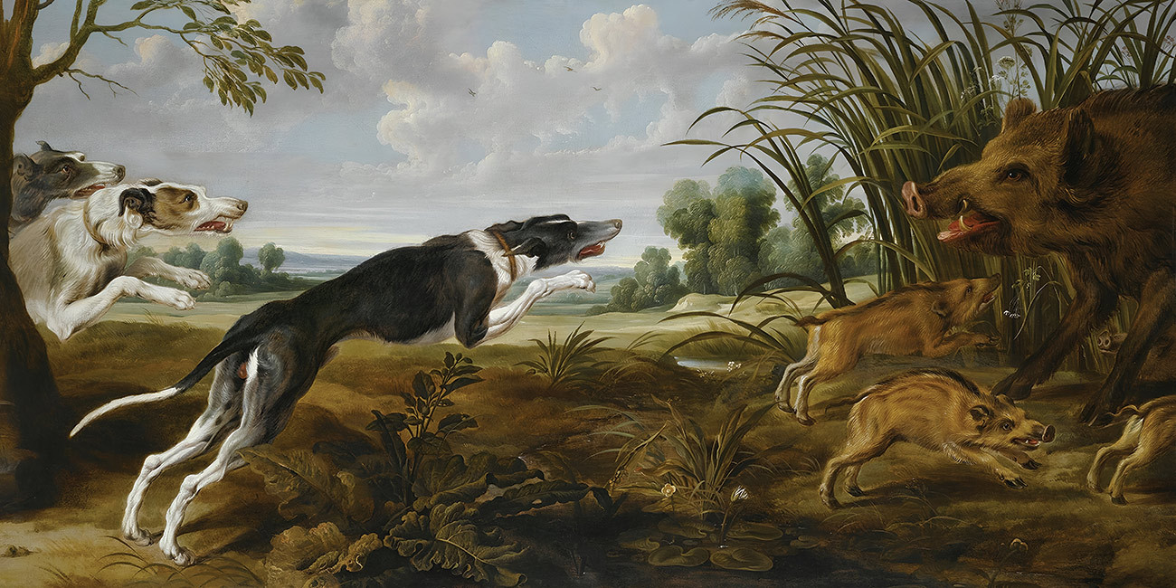 репродукція картини відомого художника Воса Пауля — "Три гончих нападают на дикого кабана и его детенышей в большом пейзаже"