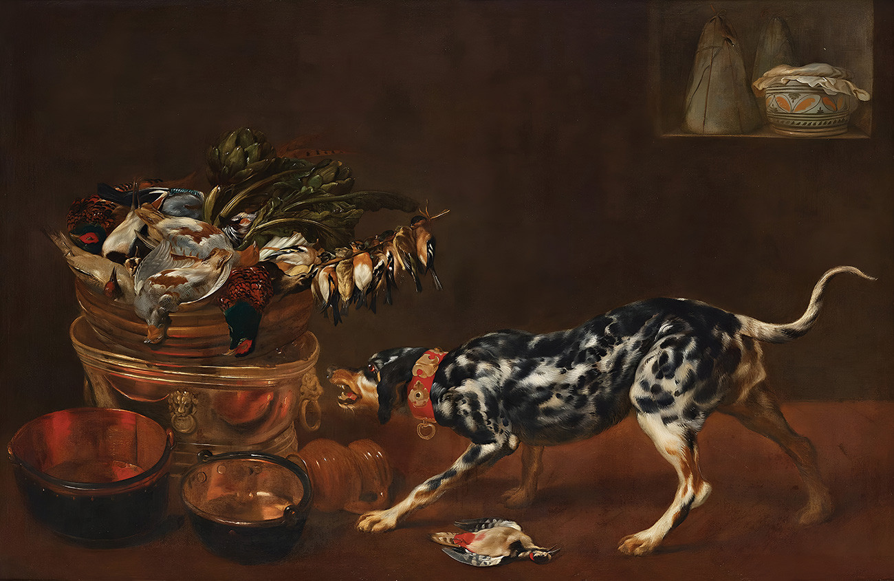 ₴ Репродукция натюрморт известного художника "Интерьер кухни с собакой, котом и птицами" - Вос Пауль де