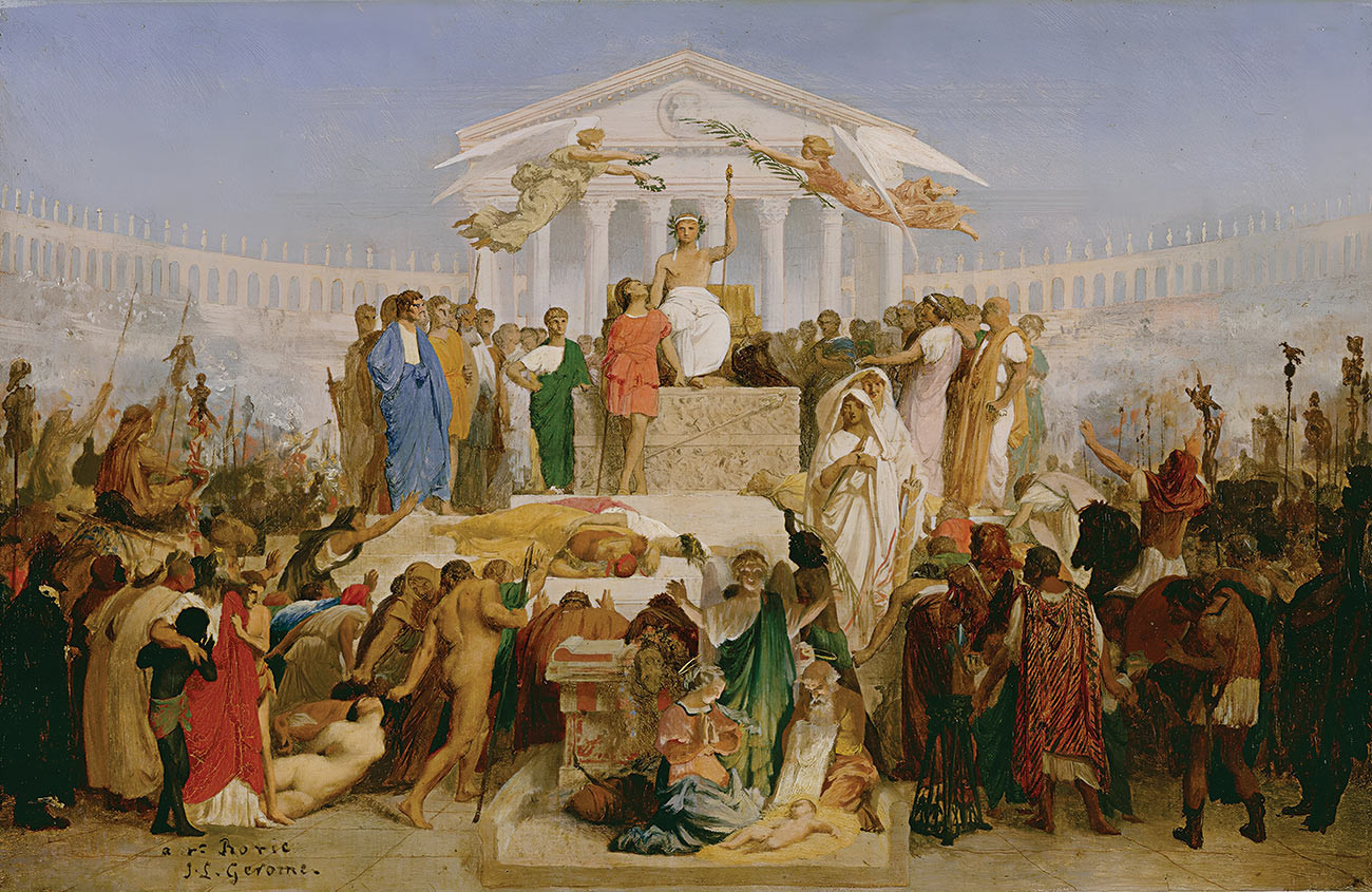 В 1852 году Жан-Леон Жером получил государственный заказ, чтобы нарисовать большую роспись аллегорического наполнения по своему выбору. Выбирая эту тему, Жером, возможно, стремился льстить императору Наполеону III, правительство которого заказало картину, и которого назвали "новым Августом". В рамках подготовки к своей большой росписи, Жером много путешествовал, чтобы найти соответствующие этнические типы, чтобы изобразить различные народы древнего мира. Когда картина была показана в 1855 году на Всемирной выставке, его мастерство в изображении различных национальностей, заставило некоторых заметить, что Жером произвел много сессий зарисовок, когда писал картину.