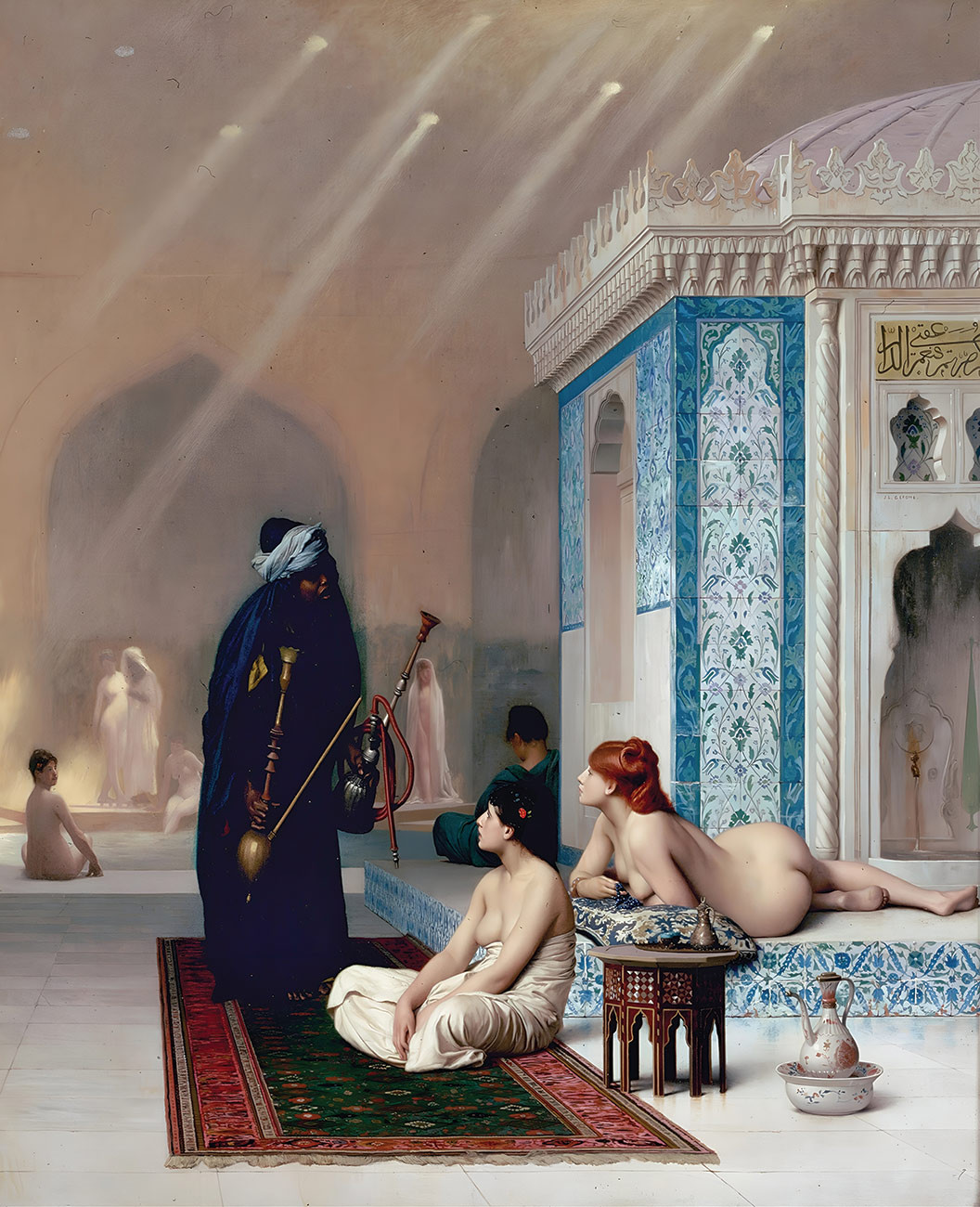 Картина привлекает красотой изображенных женщин, их золотыми волосами, шелковистой кожей. Белая с голубым цветовая гамма интерьера вносит впечатление свежести и воздушности.