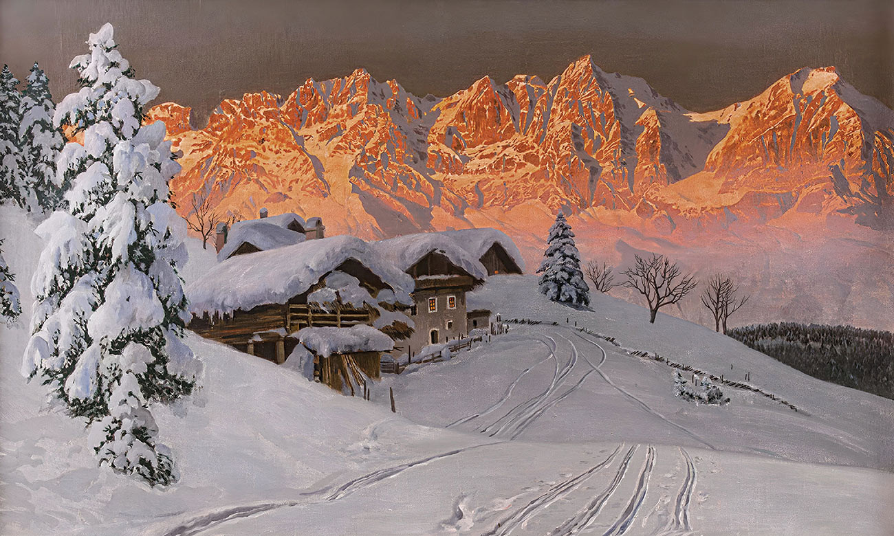 ₴ Репродукція краєвид відомого художника "Зимовий захід сонця у горах" - Арнегер Алоїс