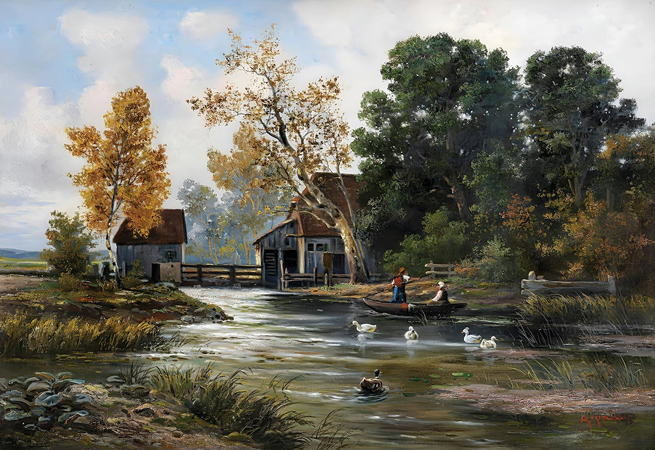 ₴ Репродукція краєвид відомого художника "Водяний млин з качками" - Арнегер Алоїс