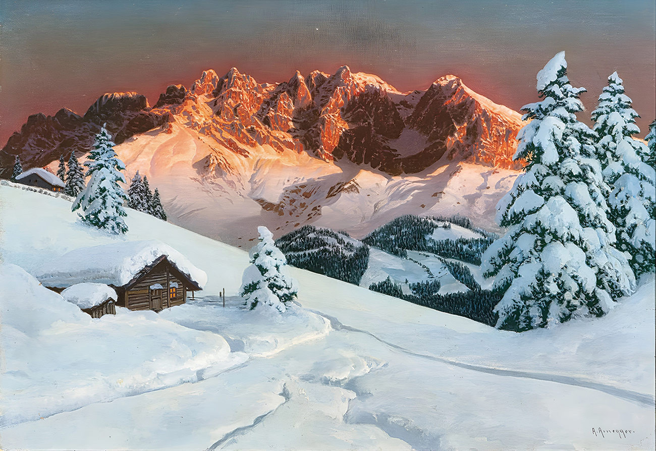 репродукція краєвиду відомого художника Арнегера Алоїса — "Альпійське сяйво у Вільдер-Кайзері поблизу Кітцбюеля"