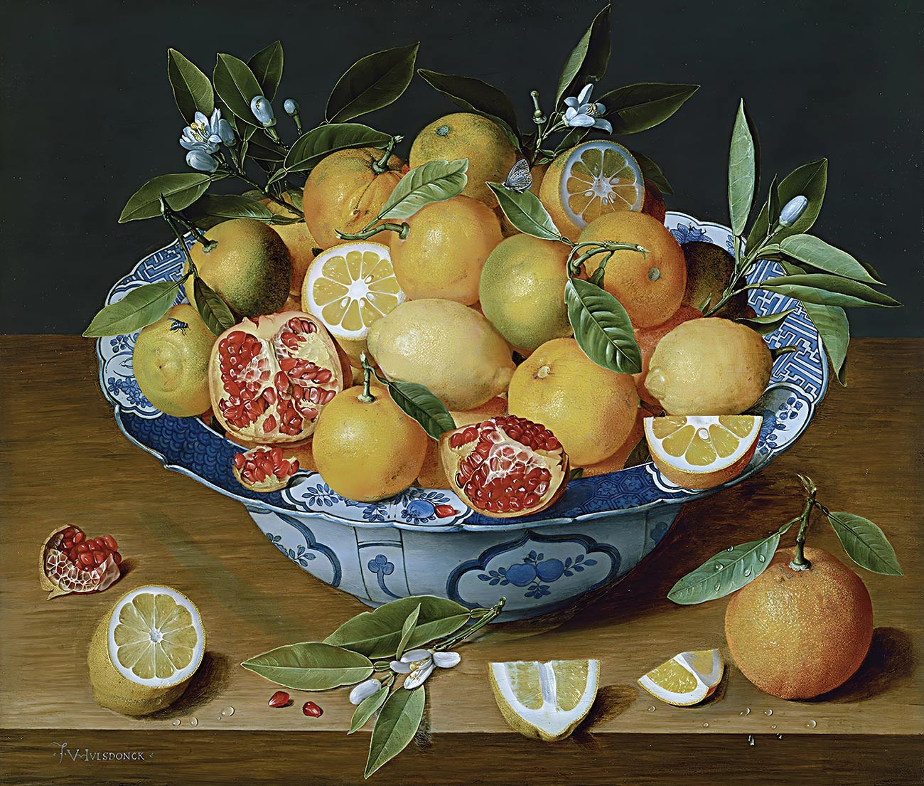 Халсдонк, майстер процвітаючої студії, що спеціалізується на живописі натюрморту, ретельно малював кожну поверхню та фактуру із фруктів, порцеляни та дерев'яної стільниці на цій картині. Він ретельно промальовував натюрморт з високої точки зору, щоб можна було бачити більшу частину столу та вміст чаші. Лимони, апельсини та гранат, деякі розколоті, щоб показати їх соковиті начинки, спочивають у китайській синьо-білій порцеляновій мисці, що датується періодом Вань-Лі династії Мін. Натюрморт свідчить про крихкі та швидкоплинні властивості природного світу (див. статтю про емблематику в натюрморті). Ямочка на шкірі лимонів і апельсинів, соковиті, блискучі нутрощі граната, акуратно скріплені тонкою білою тканиною м'якоті, листя і квіти все ще прикріплені до фруктів, і блискучі крапельки води на передньому плані - все це блискучі, короткочасні ефекти.