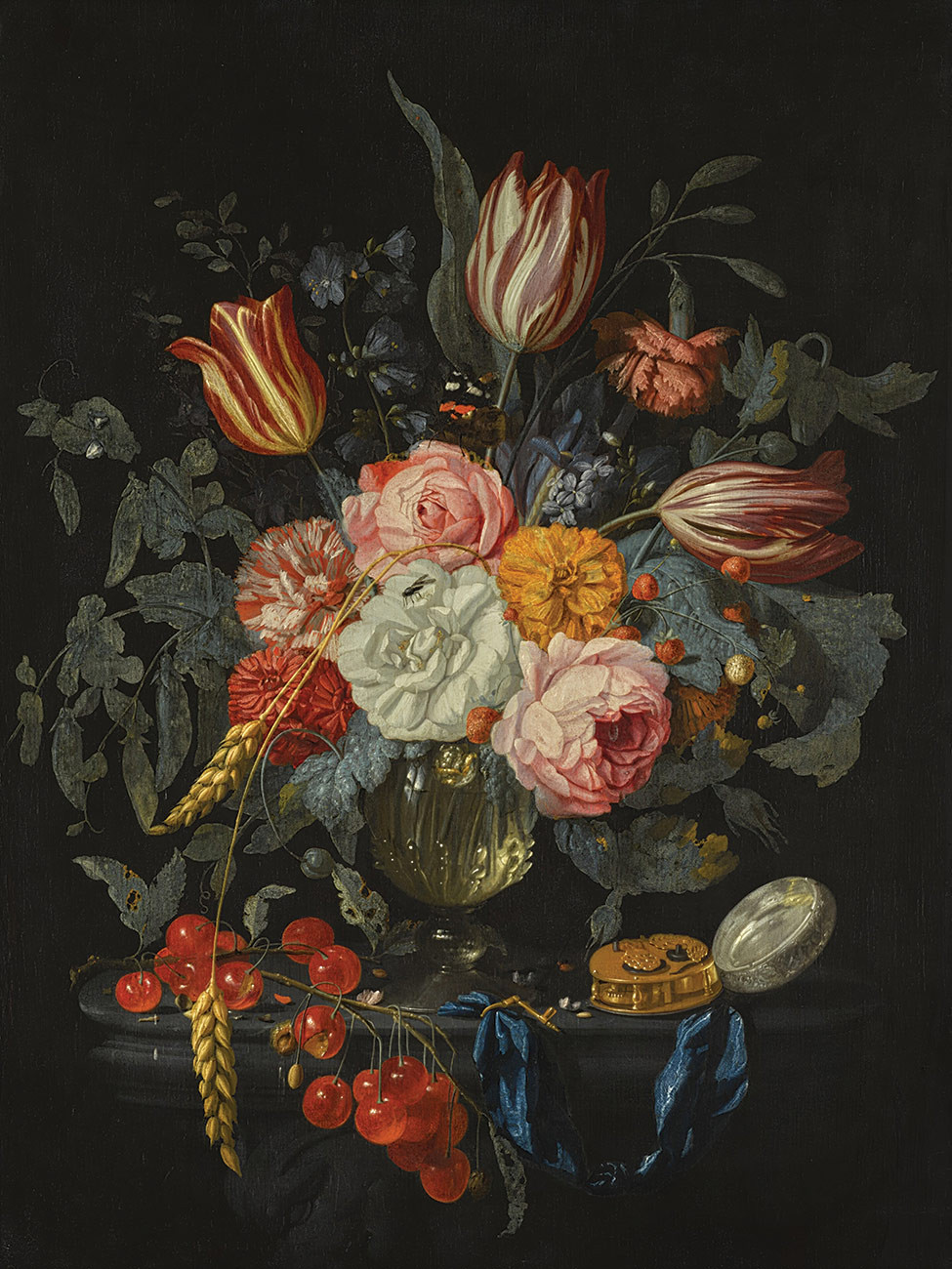 ₴ Репродукція квітковий натюрморт "Тюльпани, троянди та інші квіти у скляній вазі з черешнями та годинниками на виступі" - Ханно Йоханнес