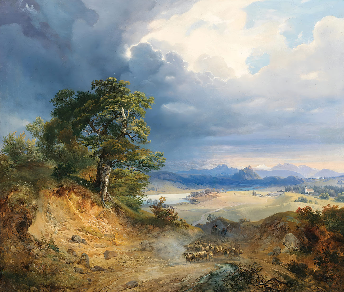 репродукція краєвиду художника Хольцера Жозефа — "Карпатський краєвид з пастухом та його стадом"
