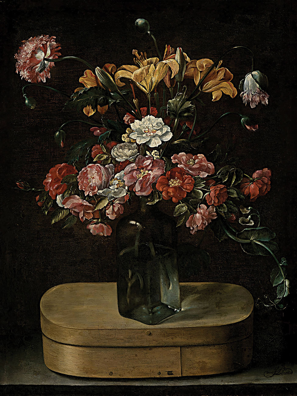 ₴ Репродукція квітковий натюрморт "Букет квітів на дерев'яній коробці" - Лінар Жак