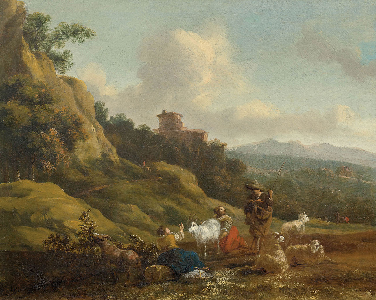 ₴ Репродукція краєвид "Італійський краєвид з пастухами та вівцями" - Моммерс Хендрік