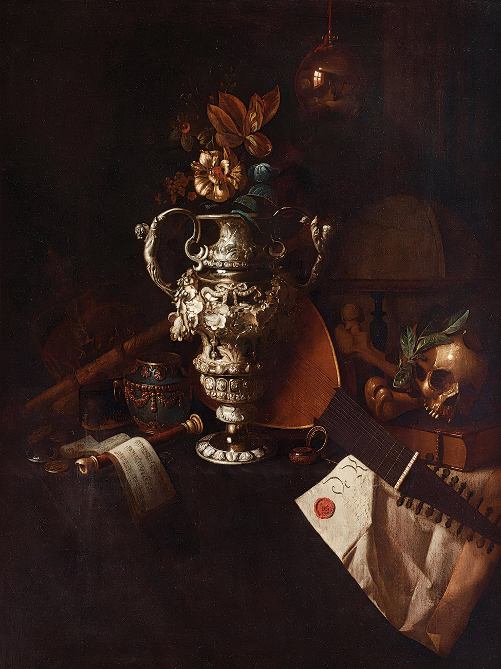 придбайте репродукцію натюрморт відомого художника Роестратена Пітера — "Ванітас з регаліями, музичними інструментами, що відображає імперською сферою, черепом і кістками та грамотою"
