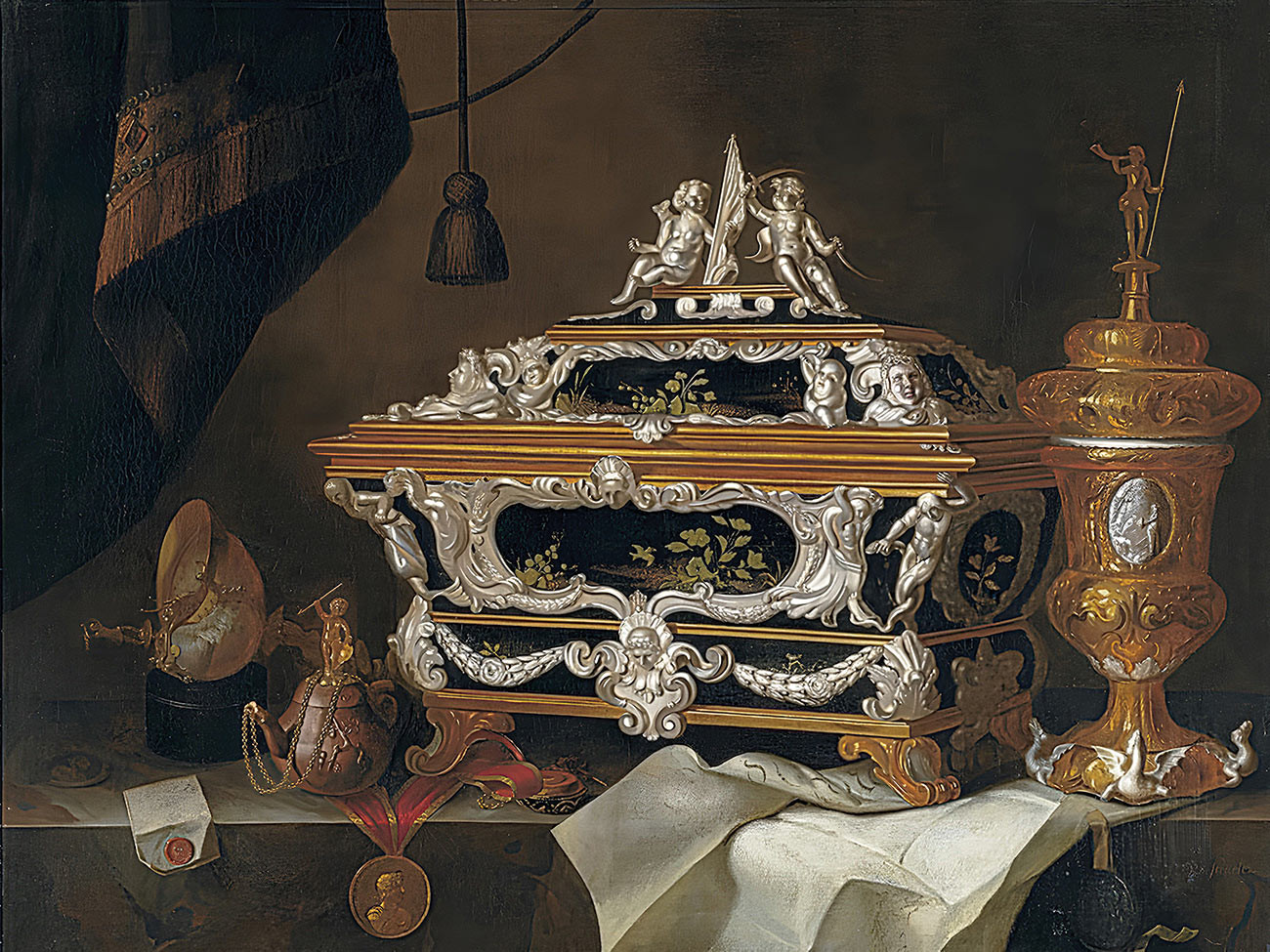 ₴ Репродукція натюрморт відомого художника "Складна срібна та чорна лакована скринька, позолочений кубок, чайник, лист, медальйон, кубок наутілус та годинник на виступі" - Роестратен Пітер Герріц ван