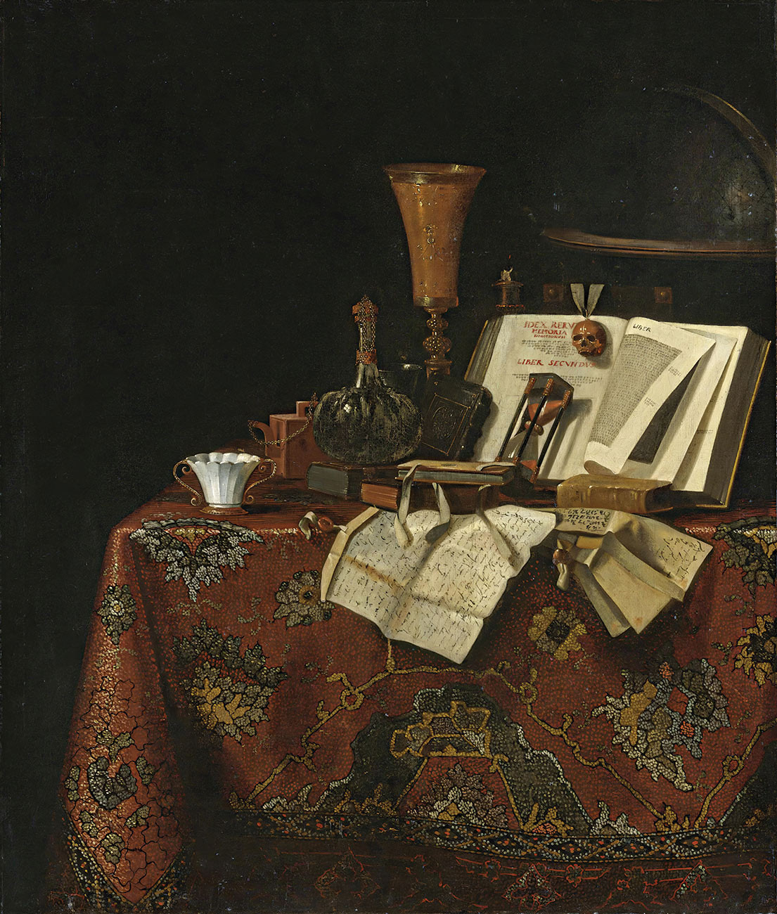 ₴ Репродукція натюрморт відомого художника "Натюрморт Vanitas з келихом, посудиною для вина, ісінським керамічним чайником, книгами, пісочним годинником, листами та глобусом на килимовому столі" - Роестратен Пітер Герріц ван