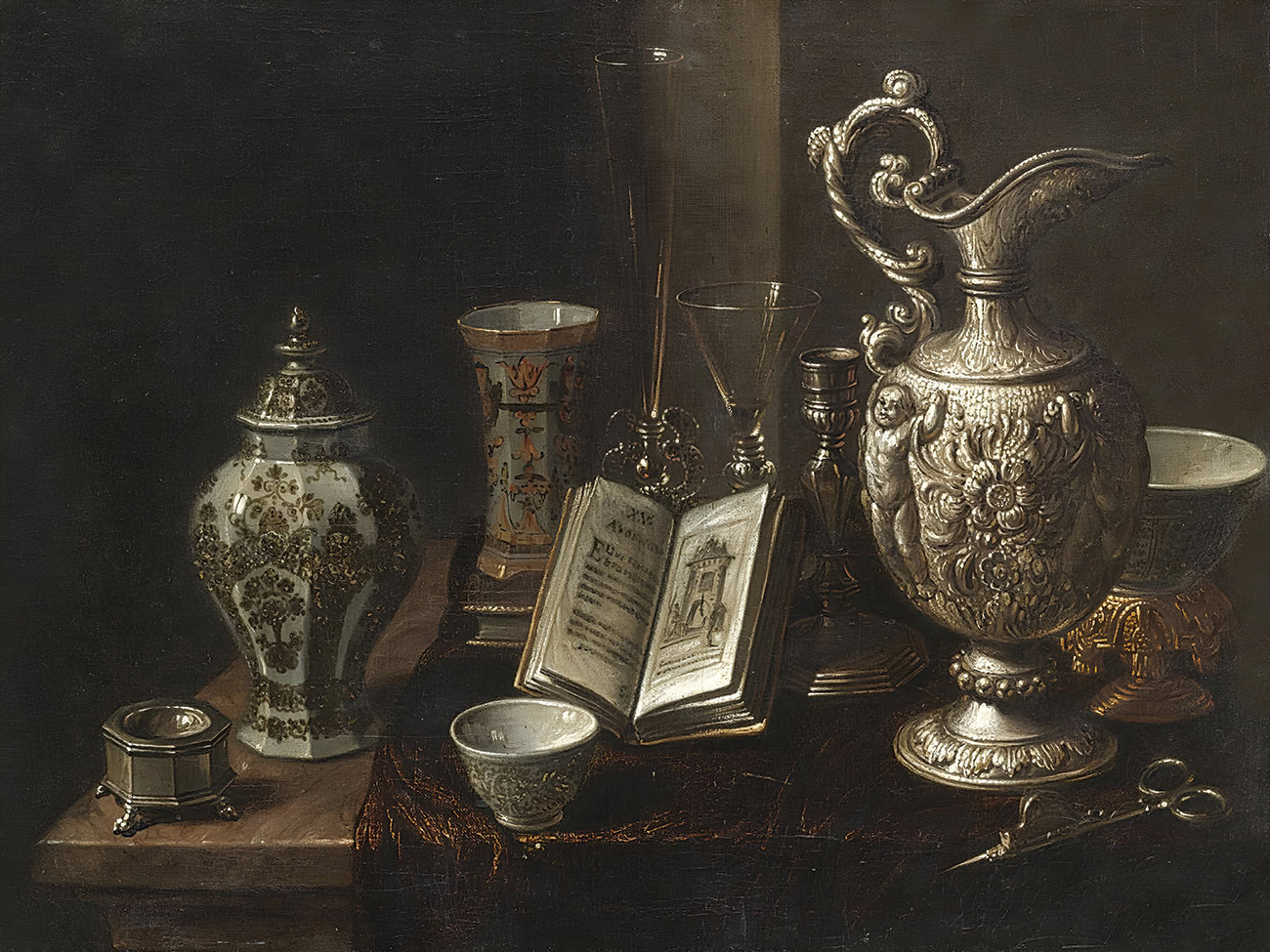 ₴ Репродукція натюрморт відомого художника "Натюрморт зі срібним глечиком, гасильником для свічок, різними склянками та порцеляновими вазами разом на мармуровому столі, задрапірованому тканиною" - Роестратен Пітер Герріц ван