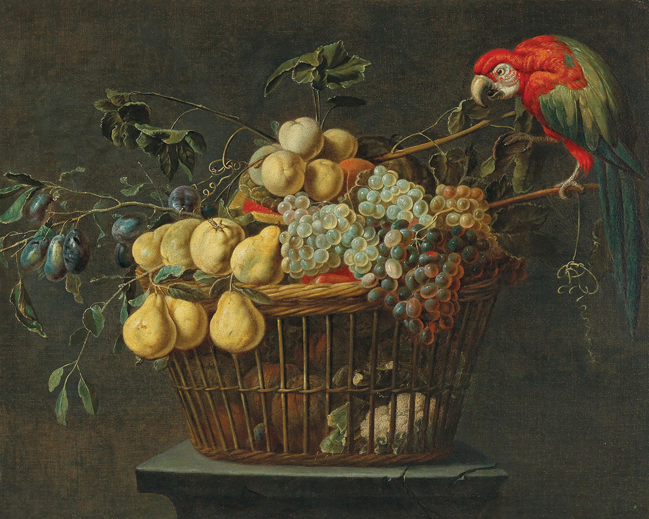 придбати репродукцію натюрморт художника Утрехта Адріана — "Натюрморт з кошиком фруктів та папугою"