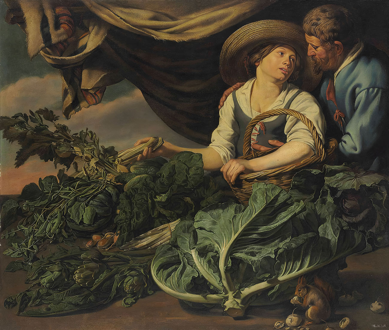 Картина Адріана ван Утрехта «Закохана пара з листям салату, артишоками, горошком та іншими овочами, а також білка» – це майстерне зображення як земних задоволень, так і символічних мотивів. Центральні фігури, закохана пара, оповиті великою кількістю свіжих продуктів, що натякає на щедрість природи та задоволення, яке можна знайти в романтичному коханні. Певні овочі, таки як листя салату (що символізує родючість) та артишоків (що символізують єдність), ще більше збагачує алегоричний зміст картини. Присутність білки, яку часто асоціюють з хитрістю та бешкетництвом, додає сцені грайливий елемент, а також натякає на складність, властиву людським стосункам. Майстерне використання ван Утрехтом світла та тіні створює відчуття близькості та глибини, залучаючи глядачів до цієї чарівної картини кохання та достатку.