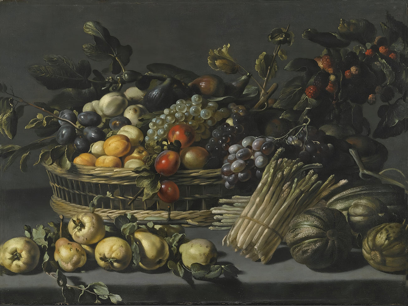 ₴ Репродукція натюрморт "Натюрморт з фруктами, складеними високо в кошику, оточений айвою, динями та спаржею на виступі" - Утрехт Адріан ван