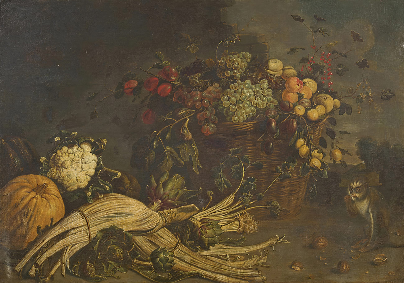придбати репродукцію натюрморт художника Утрехта Адріана — "Натюрморт з фруктами у плетеному кошику, овочами та мавпою"