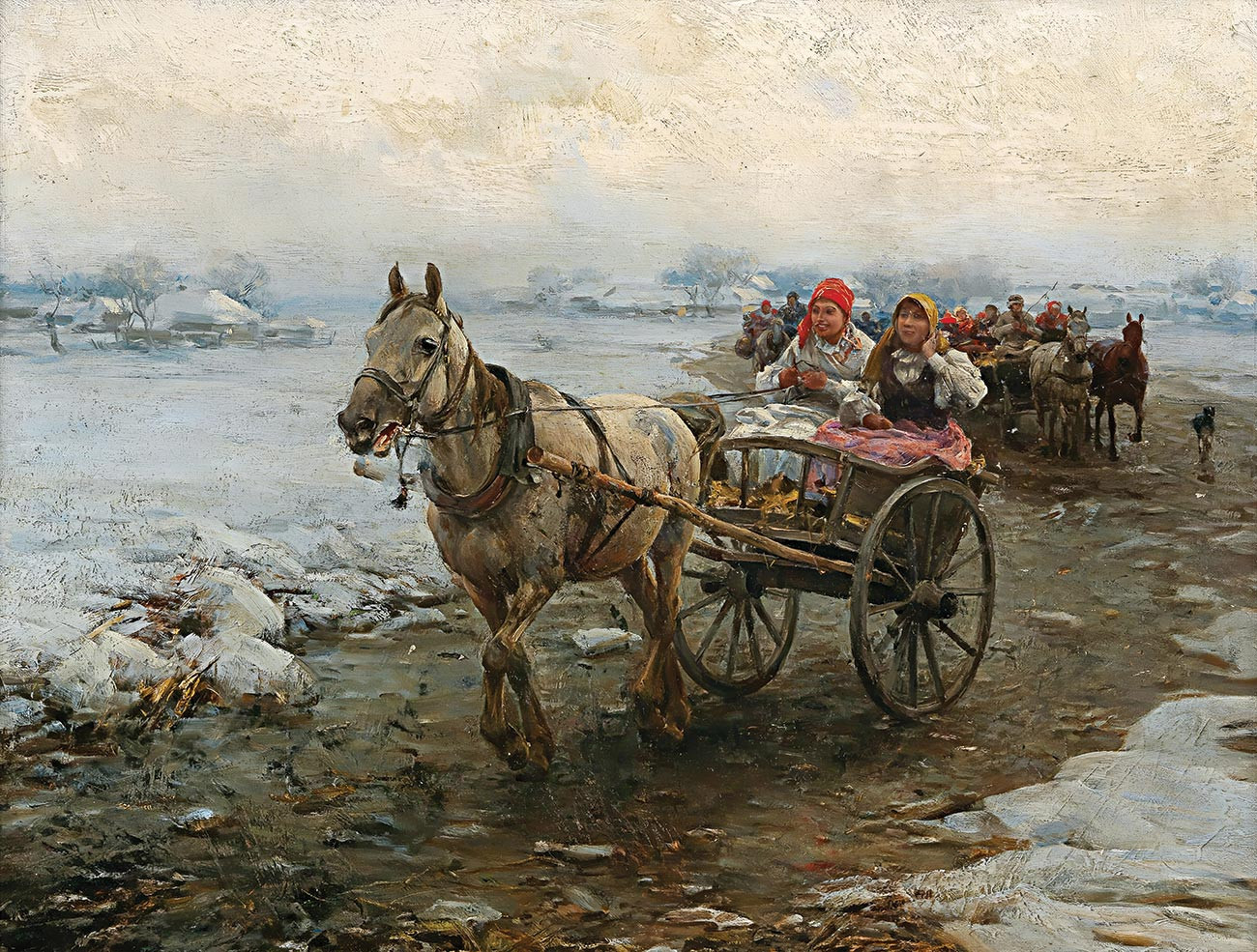 Альфред фон Веруш-Ковальський польський художник, відомий своїми приголомшливими зображеннями сільського життя та пейзажів. На картині зображено кінний візок, що проїжджає по засніженому ландшафту, всередині якого знаходиться група людей у теплому одязі. М'які, приглушені кольори та ніжні мазки надають картині мрійливості, немов це сцена з казки.